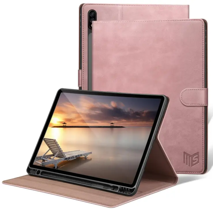 The Suanpot Flip Book Case for Samsung Galaxy Tab S8/S7 offers durable PU leather protection with a precise fit that keeps your tablet secure. Its built-in folding stand and pencil holder add convenience for work, study, or entertainment, making it easy to type, draw, or watch videos hands-free. The elegant rose-gold finish provides a stylish look while ensuring full coverage and everyday protection for your device