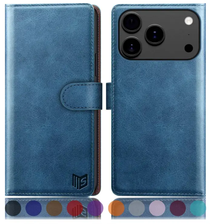 The Suanpot Wallet Case for iPhone 17 Pro Max combines durable PU leather protection with a precise fit that keeps your device secure. Its built-in RFID-blocking card slots protect your cards and ID from unauthorized scanning, making it ideal for daily use and travel. The elegant sky-blue flip design adds both style and convenience, allowing you to carry essentials like cards and cash without needing a separate wallet